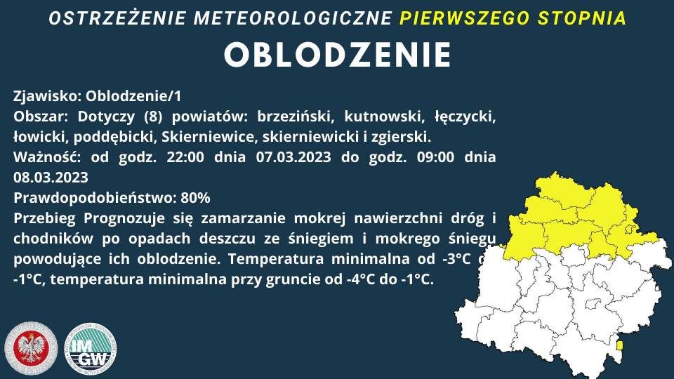 Ze skutkami zamarzania opadów deszczu ze śniegiem i śniegu, jako pierwsi będą się mierzyć mieszkańcy północnych powiatów Łódzkiego. Dla mieszkańców regionów: brzezińskiego, kutnowskiego, łęczyckiego, łowickiego, poddębickiego, skierniewickiego i zgierskiego ostrzeżenie I stopnia obowiązuje od wtorku, 7 marca, od godziny 22.00 do środy, 8 marca d godziny 9.00.
