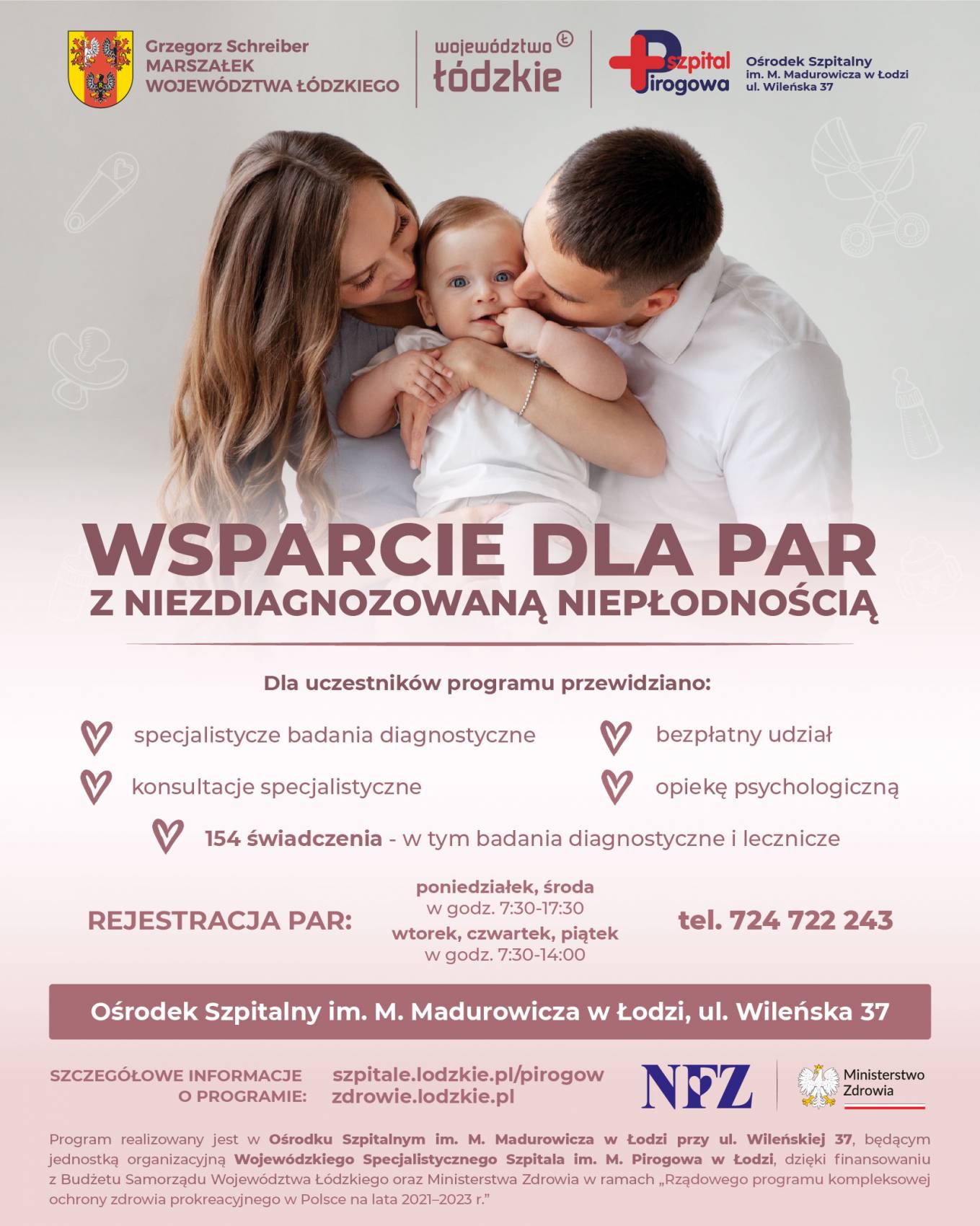 Do programu zarejestrować się można pod numerem telefonu 724 722 243. Zachęcamy wszystkie pary, które starają się o zajście w ciążę, do bezpłatnej diagnostyki i podjęcia leczenia w Ośrodku Szpitalnym im. M. Madurowicza w Łodzi.